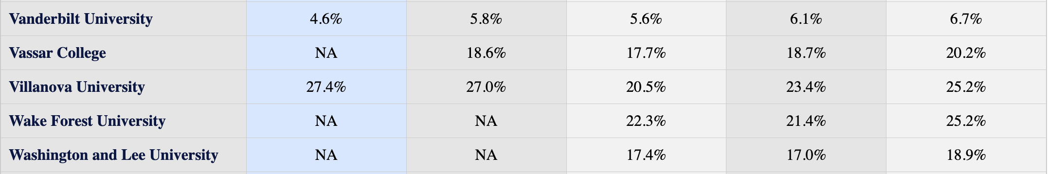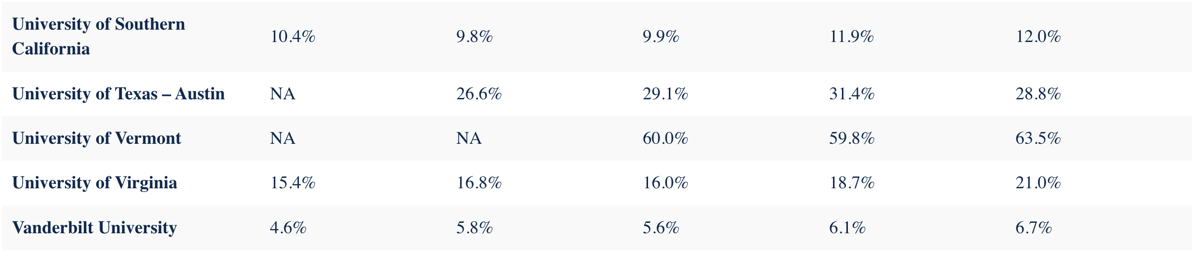 Vanderbilt is one of the most consistently selective schools in the dataset. Its acceptance rate has hovered between 4.6% and 6.7% across all five years, never crossing 7%. Unlike schools whose rates fluctuate widely year to year, Vanderbilt's stability signals a highly controlled admissions process. Applicants should treat it as a reach school regardless of the year they apply.